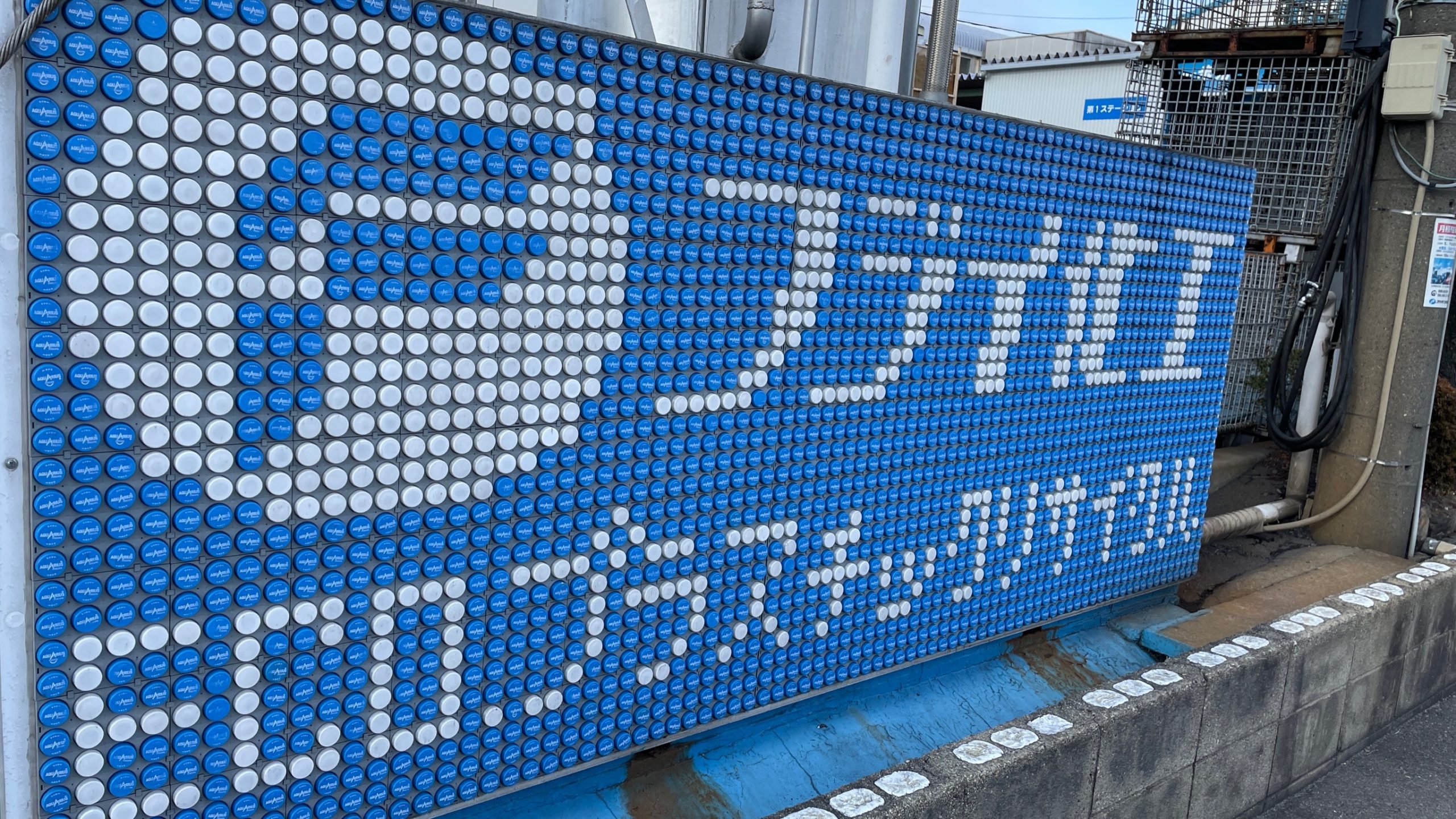 キャップで作られた青い看板が目印です!
