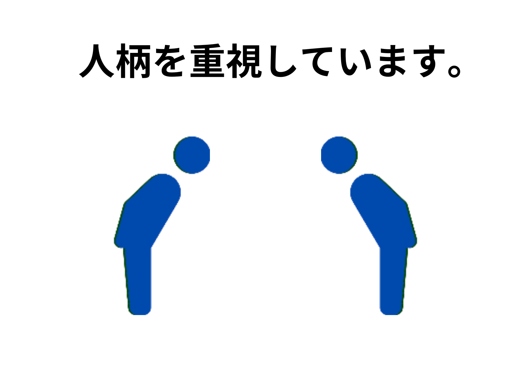 人柄とは、お客様にサービスが提供できる方かどうかです。 サービスの基本は「あいさつ」です。